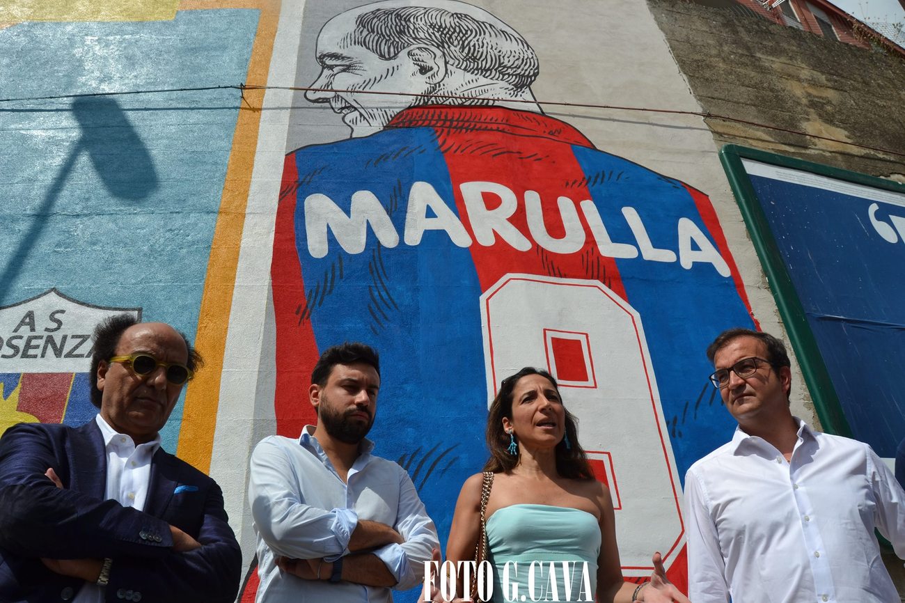 Un’immagine diretta è quella del nuovo murales dell’artista romano Lucamaleonte in onore di Gigi Marulla. Un’opera molto bella ed essenziale, rappresenta l’eterna bandiera del Cosenza volto di spalle con la maglia numero nove con cui, da giocatore, faceva tremare le difese avversarie. La parte che colpisce di più è il volto… Gigi è di spalle ma ha la testa girata con quel sorriso umile che illuminava sempre il suo viso. A presentare la raffigurazione il Sindaco di Cosenza Mario Occhiuto con il figlio di Gigi, Kevin Marulla e il Presidente del Cosenza calcio Eugenio Guarascio. Hanno assistito anche altri familiari i quali hanno sottolineato, insieme ad altre persone, tifosi e non, la bellezza del ritratto. Molti, infatti, alla presentazione del primo murales, quello pitturato da Favelli, avevano manifestato il proprio dissenso. L’artista aveva sottolineato, tramite l’arte concettuale, l’assenza, invece, Lucamaleonte ha creato, prendendo spunto da una foto di Andrea Rosito, un’immagine che suscita, nella visuale dell’osservatore, l’immediatezza del significato. In questo modo l’icona di Marulla resterà in modo indelebile nella città di Cosenza. “Era una cosa che dovevamo a tutti – afferma il Sindaco Occhiuto – , la città, i tifosi, la famiglia Marulla e al nostro campione perché è un uomo che aveva delle doti importanti e da ricordare. E’ un modello esemplare per i giovani. Questa parete è abbellita da due murales di due artisti di fama internazionale. Favelli ha fatto un’opera concettuale che interpreta l’assenza del nostro campione, invece Lucamaleonte rappresenta Marulla che, girandosi di spalle, sorride verso il primo murales e la città. E’ il primo tassello di una parete che vogliamo dedicare ad altri campioni della città di Cosenza”. Da Cosenza, con questi due murales, parte un forte messaggio: “In realtà abbiamo sempre ricordato figure di statisti, politi, storici e filosofi. Abbiamo avuto campioni importanti che resteranno nel cuore delle persone e fanno parte dell’identità cosentina. Oggi abbiamo dato un segnale importante perché la figura di Marulla incarna il vero spirito da sportivo e di un campione di umanità”. Emozionato il figlio di Gigi, Kevin Marulla: “provo tanta emozione, ma voglio essere lucido per ringraziare il Sindaco e tutte le persone che hanno realizzato queste due opere d’arte. La prima è un punto di vista molto sottile della sua assenza, mentre quella a fianco è di impatto e più diretta. Credo che mio padre guardando la prima opera avrebbe fatto lo stesso sorriso”. Che cosa lascia Gigi a Kevin? “Mio padre è stato un uomo di grandi valori e di umiltà. Sembrano frasi fatte, ma è così perché mio padre era molto semplice. E’ rimasto sempre quel ragazzino che viveva a Stilo. A tratti era in imbarazzo quando qualcuno gli faceva notare la sua grandezza. Questi valori voglio testimoniare verso un calcio pulito e di grandi contenuti”
