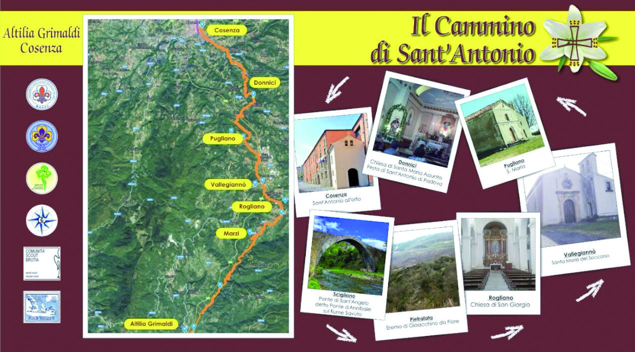 L’area naturale della valle del Savuto è un cuore di emozioni antiche racchiuse da una vegetazione splendidamente insolente. La natura mediterranea, tra boschi e borghi antichi, disegna una valle incontaminata incurvandosi a nord tra le propaggini della città di Cosenza, ad est sfiorando i primi monti della Sila Piccola e ad ovest i Piani di Altilia.A dare nome e identità a un territorio forte, aspro, tortuoso a tratti, ma anche dolce e piano con percorsi sempre diversi e di una bellezza rilassata e potente insieme, è il fiume Savuto, conosciuto anticamente dai greci con il nome di Ocinarus e chiamato poi dai romani Sabbatus. Incastonati in questo ambiente dal paesaggio estremamente vario e la promessa non tanto lontana di profumi marini provenienti dal Tirreno, una ventina di comuni dall’anima secolare. Qui il vagare, per un viaggiatore amante del cammino, sarà un dolce piacere e motivo di (ri)scoperta di percorsi storici, religiosi, enogastronomici dall’identità culturale forte e antica.A Marzi incontriamo i vigneti di produzione delle uve del “Savuto DOC”. La località “Pietralata”, eremo dove Gioacchino da Fiore scrisse le sue prime opere.A Rogliano si possono ammirare incredibili esempi di barocco architettonico e scultoreo. In particolare, questo comune della provincia di Cosenza vanta una tradizione pressoché unica nella lavorazione del legno, tanto che nel settecento era celebre come centro culturale e artistico grazie alle numerose botteghe di scalpellini che lavoravano il tufo o “marmo povero” e intagliatori del legno.Qui nacquero meravigliose opere scultoree, stucchi decorativi, altari, arredi lignei, statue e facciate in pietra e portali, testimonianze di una tradizione unica. Esempi ammirevoli sono le chiese di San Giorgio (Monumento nazionale), Maria SS. dell’Assunta, Madonna delle Grazie e San Giuseppe. Nella Chiesa di San Domenico Cappella dedicata a Sant’Antonio. Da visitare i due centri storici di “Donnanni” e “Cuti” custodi di antichi palazzi gentilizi. Possibilità di sosta con ospitalità in Ostello o Case Vacanze.Sul tratto tra Rogliano – Donnici (frazione di Cosenza) nel territorio del Comune di Santo Stefano di Rogliano in Località “Vallegiannò” la Chiesetta di Santa Maria del Soccorso già Convento del Frati Minori Conventuali, sicuramente in attività nel 1220 nel periodo in cui il Santo di Padova transitò per questi territori; a seguire in territorio del Comune di Paterno Calabro in località “Pugliano” la Chiesetta di Santa Maria di Pugliano già possedimento dei Monaci florensi ed eremo gioachimita.A Donnici Superiore (frazione di Cosenza) possibilità di sosta e ospitalità al “Villaggio della Speranza” gestito dalla Parrocchia posto vicino alla chiesa di Santa Maria Assunta con altre dedicato a sant’Antonio.Da Donnici si giunge a Cosenza “Centro Storico” per concludere la tappa alla Chiesetta di Sant’Antonio all’Orto.