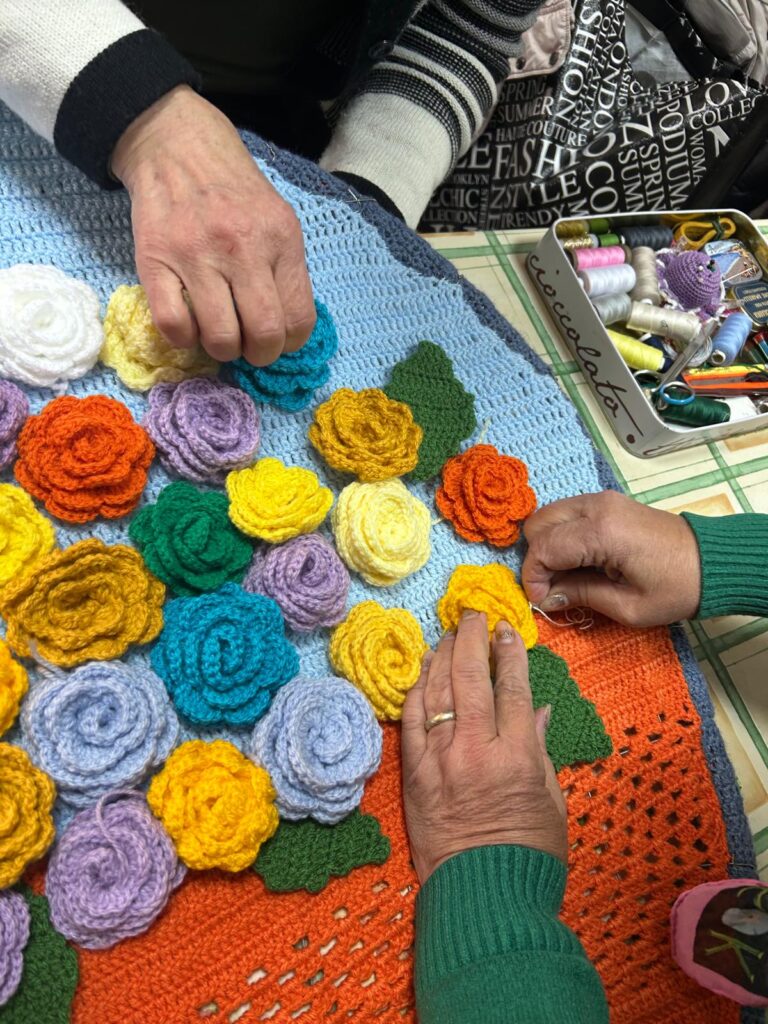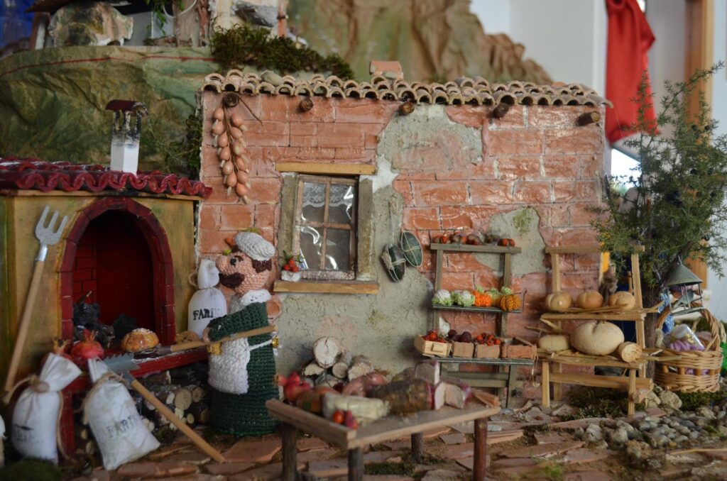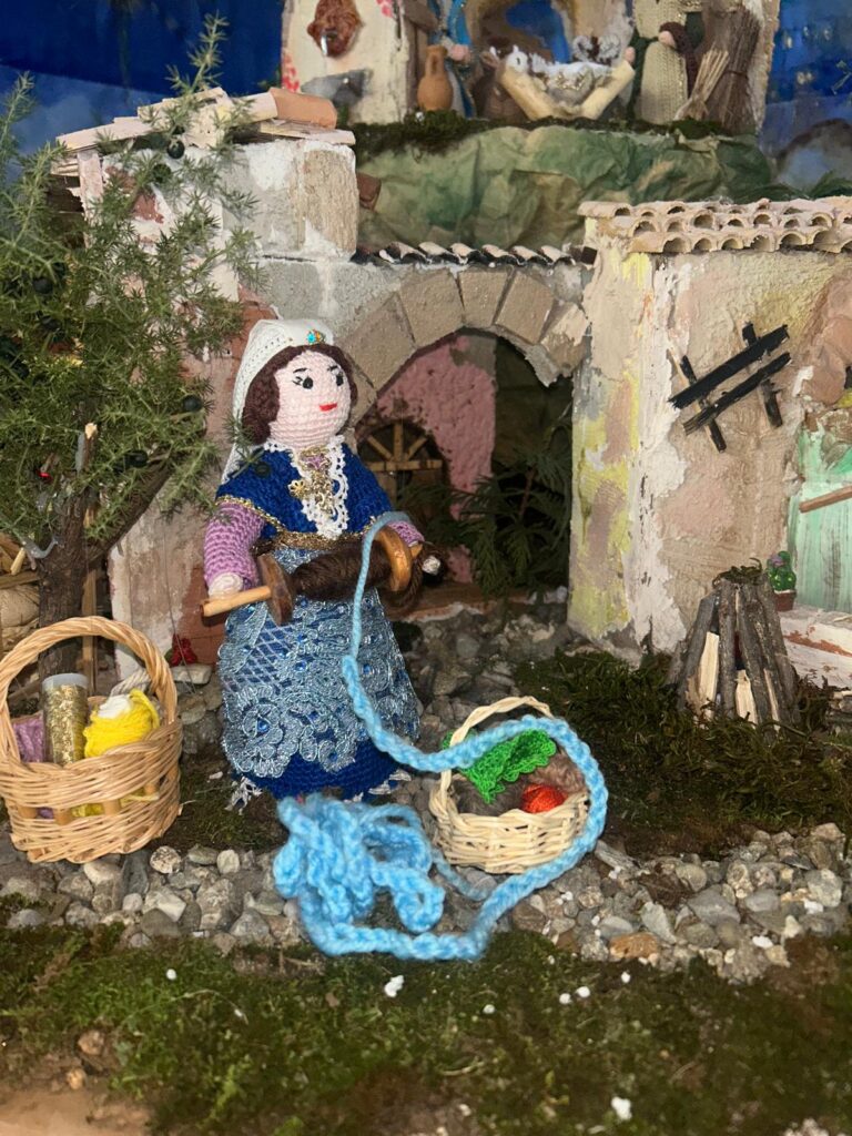 Il presepe si è arricchito di nuova energia: una signora ha aggiunto dei cestini realizzati dal suo caro marito, che non c’è più; una bambina, entrata nel laboratorio per scoprire la bellezza che vedeva con i suoi occhi, tra fili e progetti da completare, ha preso uncinetto e filo e ha creato una lunga catenella. È stata inserita nel presepe vicino alla “Pacchiana” che cuce, per simboleggiare un filo che ci unisce anche alle persone più lontane.