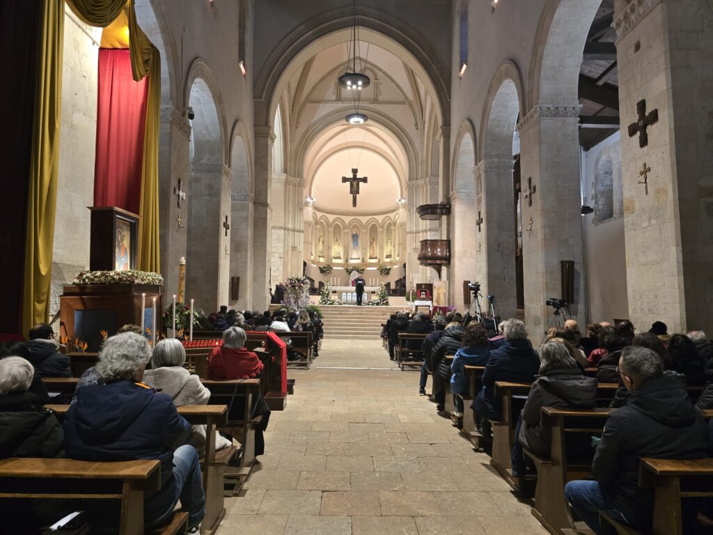 “Gioacchino, l’uomo poverissimo, Francesco, lo sposo di Madonna povertà, aiutino anche noi, ognuno, come può, dove può, dove lavora, ad essere apostoli di pace”. L’esortazione e la preghiera sono di mons. Felice Accrocca, vescovo eletto di Assisi, che domenica scorsa, in Cattedrale, ha tenuto una lectio dal titolo: “Dal Subasio alla Sila. Francesco e Gioacchino profeti di un tempo nuovo”. L’occasione è stata data dalla peregrinatio della reliquia della terra del Transito di San Francesco, a 800 anni dalla morte del Poverello d’Assisi.