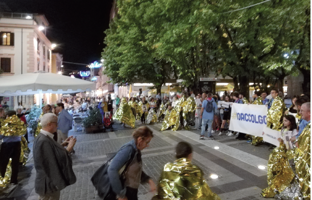 Da qui i partecipanti al convegno tra canti e slogan si sono mossi verso piazza XI settembre dove si è dato vita ad un particolare flash mob agitando le coperte termiche color oro e argento che nell’immaginario collettivo vengono associataeai valori di accoglienza, uguaglianza e solidarietà.