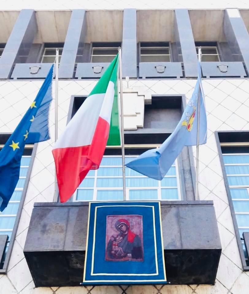 Sulla facciata del Comune di Cosenza l’immagine della Madonna del Pilerio